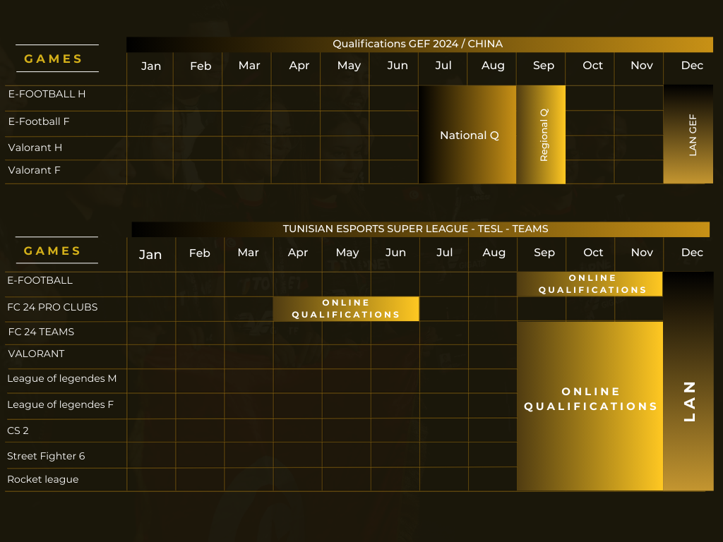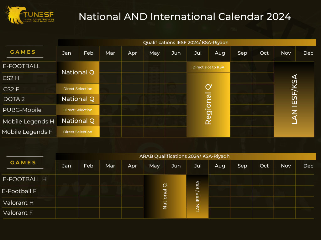 Below is the general calendar of all national and international sporting events, for the 2024 sporting season, published by the Tunisian electronic sports federation: